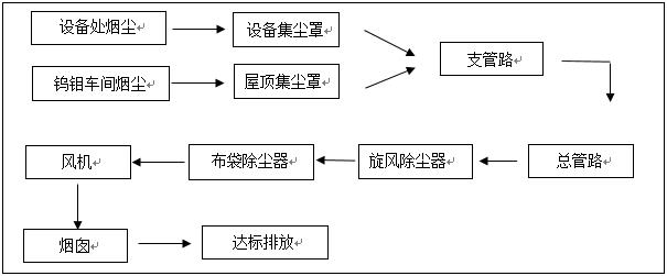 鎢鉬生產(chǎn)車間現(xiàn)有燒結設備、壓料設備、軋制設備共計5臺設備,正常作業(yè)為先從燒結設備取出板料,在通過壓料或者軋制設備加工。在取出板料的瞬間及運送到壓料或者軋制設備期間有大量的煙塵產(chǎn)生;板料在壓料或者軋制加工過程中也會有煙塵產(chǎn)生。