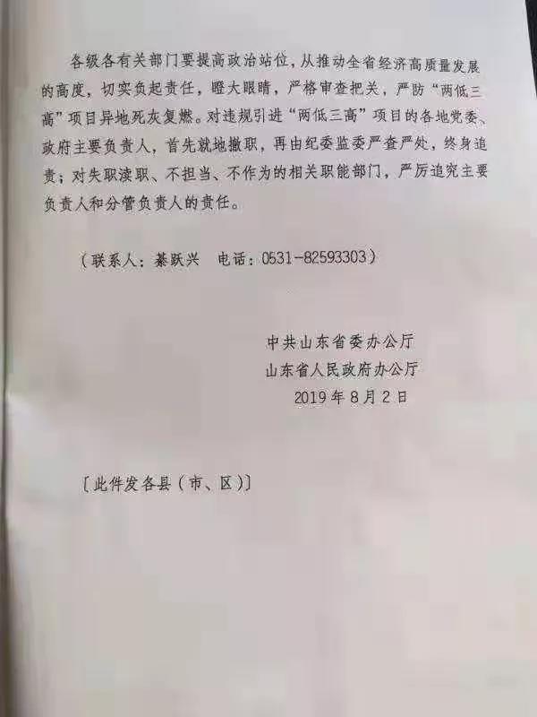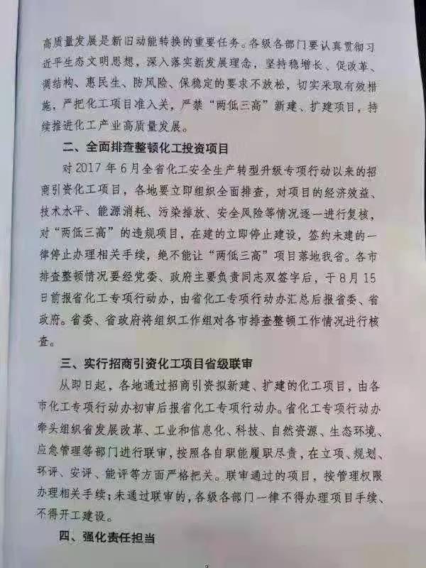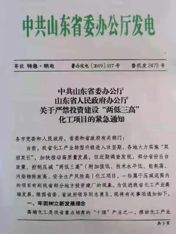 2019年8月2日,山東省政府發(fā)文,嚴(yán)禁引入“兩低三高”(附加值低、技術(shù)水平低、能耗高、污染物排放高、安全生產(chǎn)風(fēng)險(xiǎn)高)項(xiàng)目,將執(zhí)行招商引資化工項(xiàng)目省級(jí)聯(lián)審流程,全面排查整頓省內(nèi)的化工投資項(xiàng)目。