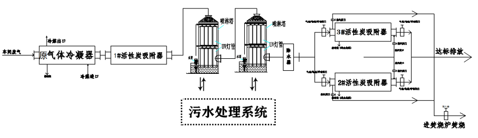 針對該工況的特殊性及復(fù)雜性,以及現(xiàn)場工況和客戶預(yù)算的實(shí)際情況,本方案采用活性炭吸附脫附多級治理+水霧分離器+uv光氧綜合治理的方法,示意圖如下